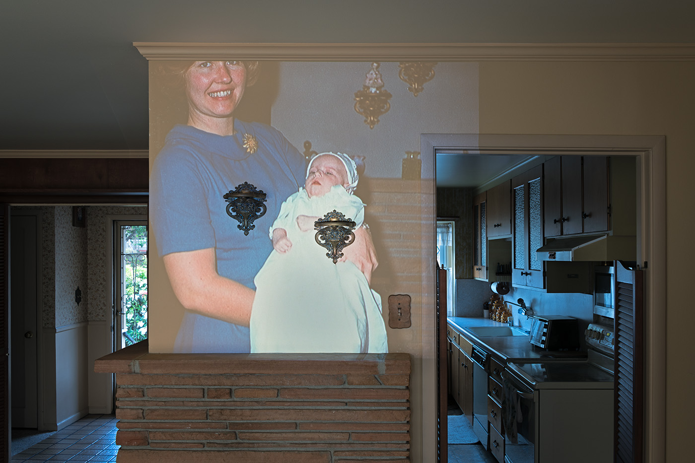 projecting family photographs onto the walls of her childhood home. Her layered compositions